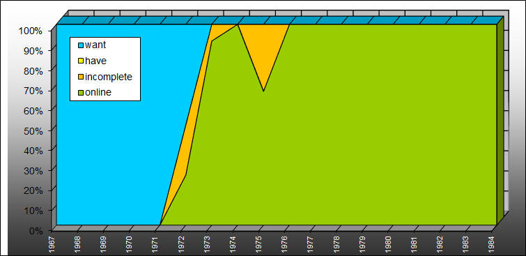 Die Listen von Januar 1972 bis Dezember 1984 liegen nahezu vollständig vor. Bei den nicht platzierten Neuvorstellungen werden wohl Lücken bleiben. Von den wöchentlichen Oldiehitparaden liegen im Zeitraum Februar 1974 bis November 1979 beinahe alle Listen vor. Vielen Dank an Florian Adler, André Böhmer, Jürgen Garske (1972-1984), Andreas Grimmig (1974-1976), Wolfgang Hengst, Hans-Joachim Klöckers (1973, 1975-1976), Lutz-Dieter Lafeld (1969-1977), Dietmar Maag, Sven Kranen, Volkmar Pontow (1972 1. Hj.), Frank Rummeleit, Uwe Scheffler und Norbert Seidenberg (1977-1984) für die Chartlisten und Ergänzungen. Ohne euch wäre diese Seite nicht möglich. |